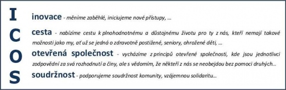 Ve své činnosti vycházíme z principů otevřené společnosti, kde jsou jednotlivci zodpovědní za svá rozhodnutí a činy, ale s vědomím, že někteří z nás nemohou bez pomoci druhých žít důstojným a plnohodnotným životem. Naším cílem je zajišťování co nejkvalitnějších a navzájem propojených služeb a programů, které odpovídají konkrétním potřebám regionu a jeho obyvatel a podporují soudržnost komunity i zapojování lidí do komunitního života.